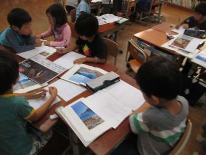 国語科「海のかくれんぼ」で学習したことをつかって,「かくれんぼカード」をつくりました。好きな海の生き物を選んで,グループごとに活動をしいます。一人一枚のカードを丁寧に仕上げます。