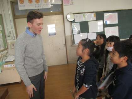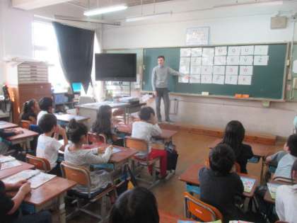 外国語活動でALTの先生に来てもらって自分のイニシャルを知りました。イニシャルを知った子どもたちは,友だちのイニシャルを知りに英語でたずねていました。