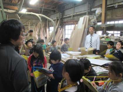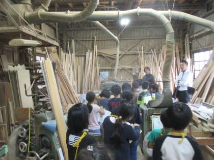 今日は養正学区にある建具屋さんに見学に行きました。工場内には,いろいろな機械や道具があって子どもたちは目を輝かせていました。