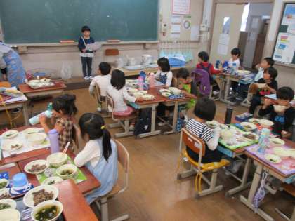 今日の給食は,麦ごはん・牛肉とれんこんの煮つけ・だいこん葉のごまいため・すまし汁・しば漬でした。一汁三菜の献立でした。しば漬の色や香り,食感,味など五感を使っておいしくいただくことができました。1年生もしば漬がすきな子が多く,喜んで食べていました。