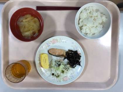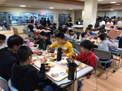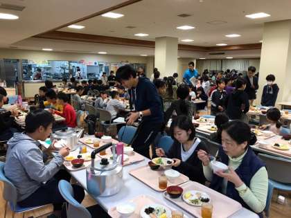 朝食です。昨夜はよく眠れたようで、食欲も旺盛でした。みんなで食べるご飯はおいしいですね。雨模様ですが、この後、予定通り魚つかみです。