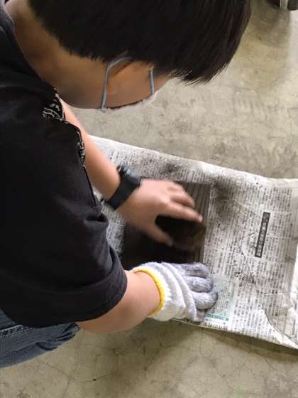 焼き板の壁掛け作りです。木目がきれいに出ている板に,思い出のペイントをしました。