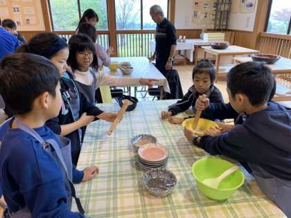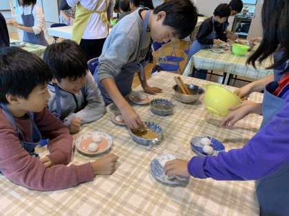 郷土料理いもぼたを作りました。今日のお昼ご飯です。もち米と里芋をつぶし,ごまときなこ味です。楽しみながら作りました。