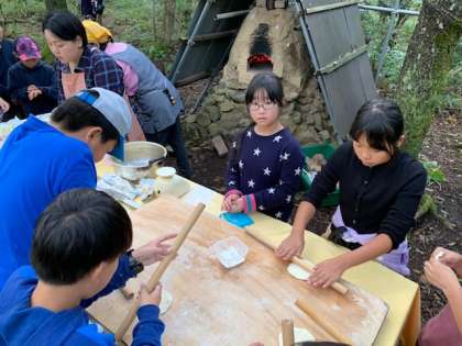 楽しみの1つ,ピザ作りです。おいしいと自然に笑顔がこぼれますね。