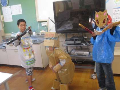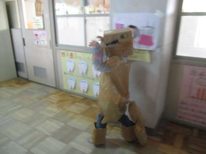 1週間遅れですが,ハロウィンの仮装大会をしました。自分たちでさまざまな材料を使い工夫して,作りました。職員室でいろんな先生に見てもらったり,廊下を練り歩いたりしました。