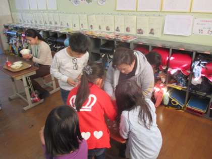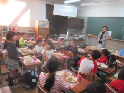 給食調理員さんが来てくれました。この日は,「ちゃんちゃん焼き」がメニューにあり,作り方などを教えてもらいました。給食が食べ終わった子どもたちは,調理委員さんの周りに集まっていました。