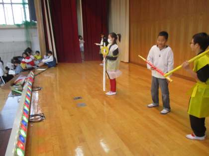 今日は初めて6年生と合同練習をしました。西遊記のナレーターやほかの役を6年生が助っ人として手伝ってくれています。明日も一緒に頑張ります。