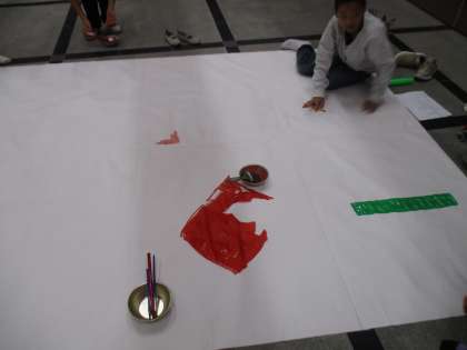 学習発表会の背景画の作成を始めました。模造紙を貼り合わせた大きな紙に描いています。出来上がりは当日のお楽しみ…