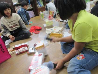 生活科では,「どんなあそびできるかな」の学習が始まりました。お家から持ってきた箱やペットボトルを使って,いろいろな遊びを考えました。たくさん箱を積んでお城を作る子や缶を上手く利用して楽器にする子など様々でした。