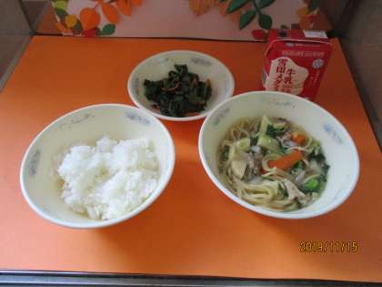 今日の給食は,ごはん・牛乳・五目あんかけラーメン・ほうれん草のいためものでした。五目あんかけラーメンには,豚肉・にんじん・白菜・青ねぎ・しょうが・たけのこ・しいたけが入っていて具だくさんでした。とろっとしていて,体が温まりました。今日は,4年生がランチルーム給食でした。