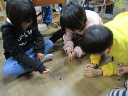 拾ってきたどんぐりで,どんぐりごまを作りました。なかなかうまく回らない中,軸のつまようじを短くすると,よく回るという大発見をした子どもたち。次々と改良し,上手に回していました。