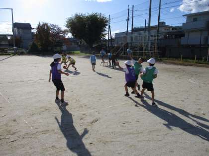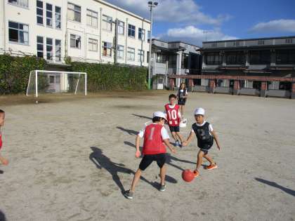 体育の学習です。ポートボールをしています。試合を重ねるごとに,チームの作戦が出てきています。ロングボールを使ったり,ショートパスをつないだりしています。