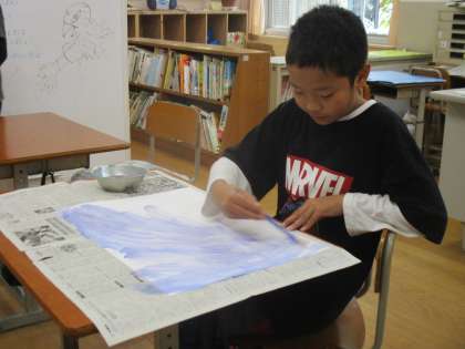 今回は絵の具を薄めた水で背景に色を付けてから絵を上からかきます。今日はその下地を塗る作業をしました。