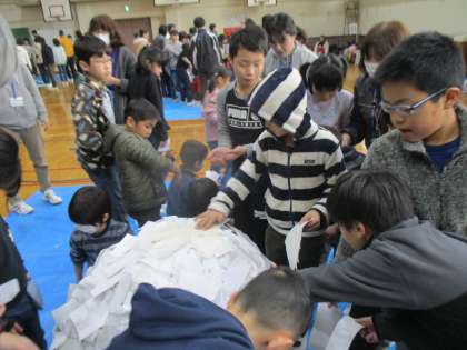 たまった新聞紙は大きな袋に集めてたまごの土台になりました。半紙を貼って,色和紙を貼って,カラフルな素敵なたまごが2つ出来上がりました。