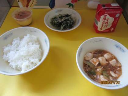 今日の献立は,ごはん・牛乳・豆腐の四川風・ほうれん草ともやしのいためナムル・プリンでした。豆腐の四川風は,トウバンジャンのピリっとした味でごはんとよく合う一品でした。プリンは,好きな子が多く喜んで食べていました。