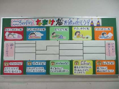 2月の保健室前掲示板は,2月の節分にちなみ,「こころの中にいるなまけ鬼を追い出そう!」です。