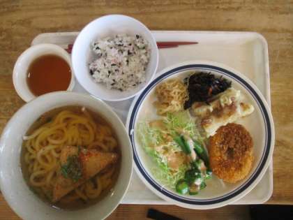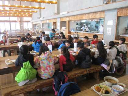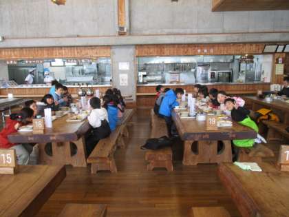 山の家での最初の食事です。きつねうどんとチャーハンのどちらかを選び,あとは楽しみにしていたバイキングです。全員が美味しそうに食べていました。