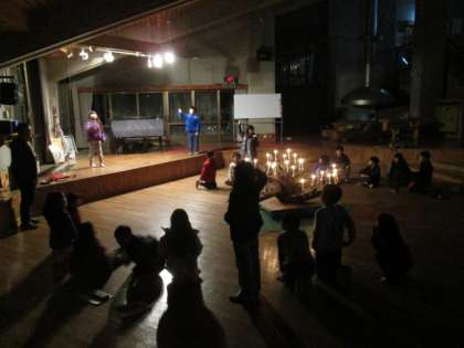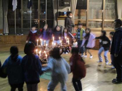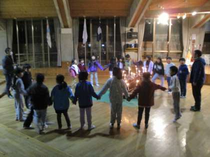 1日目最後のプログラム,キャンドルファイヤーです。火の子どもたちが灯したキャンドルの周りで,ゲームや歌をみんなで楽しみました。