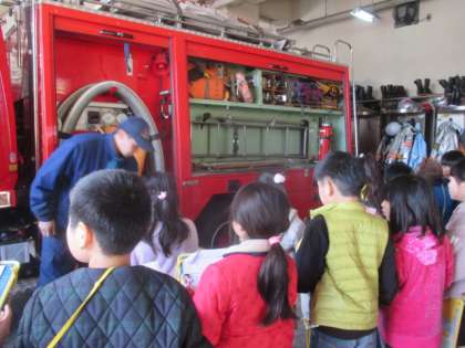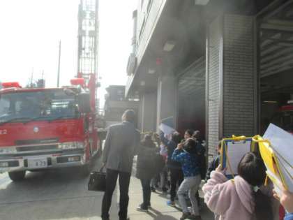 社会科の学習で消防について学習しています。この日は,左京消防署に行って消防車の仕組みや働いている人たちの仕事を学びました。