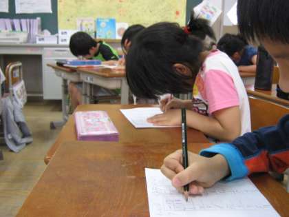 2年生では算数のじゅぎょうの前に10マス計算をしています。たしざんやひきざんを10マスだけにしゅう中してといています。