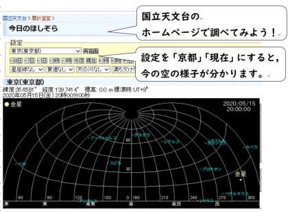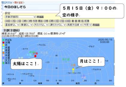 例えば,今回紹介した国立天文台のホームページhttps://eco.mtk.nao.ac.jp/cgi-bin/koyomi/skymap.cgiでは,月と太陽の場所を1時間ごとに知ることができます。さらに他の天体についても詳しく調べることができます。いろいろ調べてください。