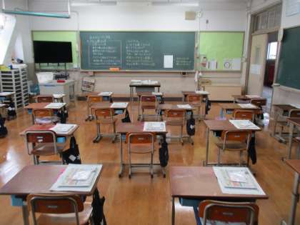 4年生のみなさん明日は1週間ぶりの登校日ですね。教室は写真の通り準備万端です!明日は前回と登校時間が異なります。明日は13時からです。持ち物と合わせてよく確認しましょう。