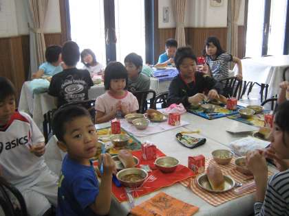 スマイル給食では,全校児童を縦割りのグループに分けて,他学年の友だちと一緒に給食を食べます。