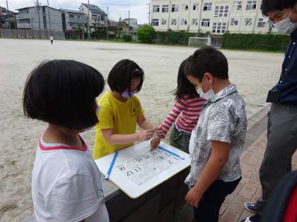 今日の登校日では,たからさがしをしました。来週の理科で使う「たね」を見つけるため,うん動場にかくされた地図のかけらを さがしまわりました。