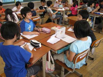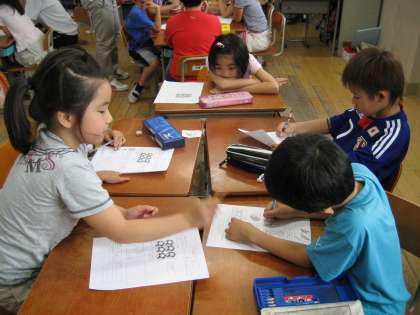 よこ24cmでボールが3つ・たてに2つ入った箱のたての長さの求め方について,みんなで話しあいました。しつ問をするときは○○さんにしつ問します,つけたしは○○さんの考えにつけたして, といった話型をつかって話し合いました。たいせつにすることでは,・進んで発表 ・わかりやすく ・くらべながら聞く ・しつ問やつけたし ・よい考えは取り入れる ・まとめよう をたしかめてから話し合いました。今日は高野中学校から職場体験の学習に来られていた生徒さんもおられ,楽しい話しあいができました。