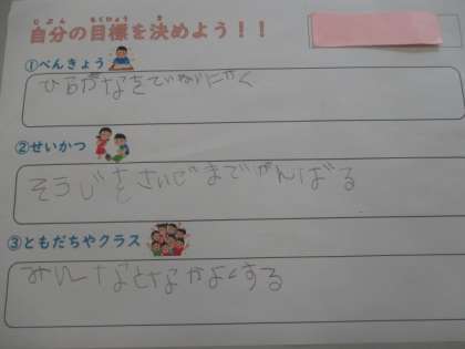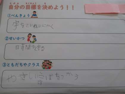 「字を丁寧に書く」「掃除をがんばる」など,それぞれがしっかり考えて目標を決めることができました。