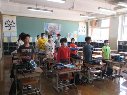 各時間ごとに姿勢を正して挨拶をします。写真は最後の挨拶です。合図が出て3秒で「さようなら」これを目指して頑張ります。集団行動を意識できると,友だちへの優しさや思いやりが増してきます。友だちを意識する第一歩として取り組んでいきます。