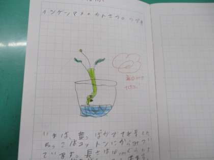理科でインゲン豆をもって帰って観察していると思います。今日は家で観察した途中結果を自学にまとめてきてくれました。みなさんも継続して観察してくださいね。