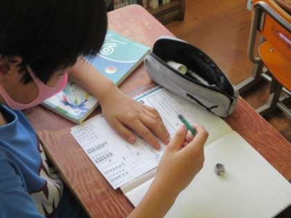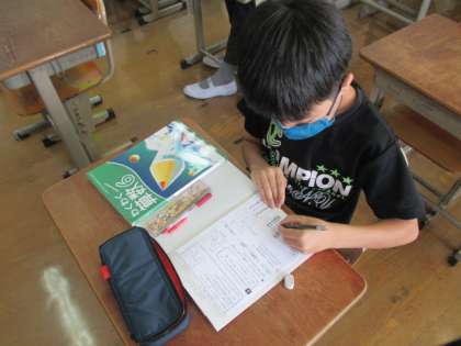点対称な図形について復習をしました。線対称な図形と比べると作図が難しいところがありますが,頭を一生懸命働かせて頑張っていました。一つ一つ全力で取り組む姿,最高でした。