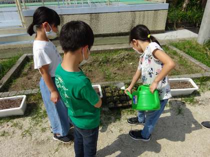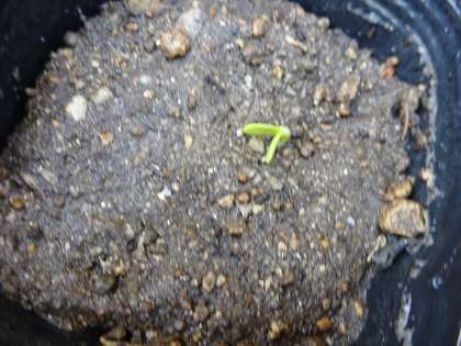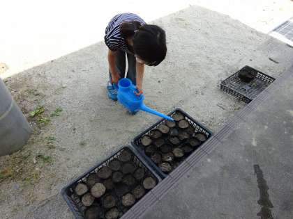 その後,ホウセンカと,前回まいたたねに水をやりにいくと…なんと!ダイズとヒマワリから,もう子葉が出ていました!!とても早くて,先生もおどろいています!