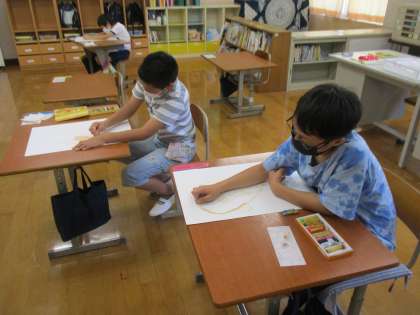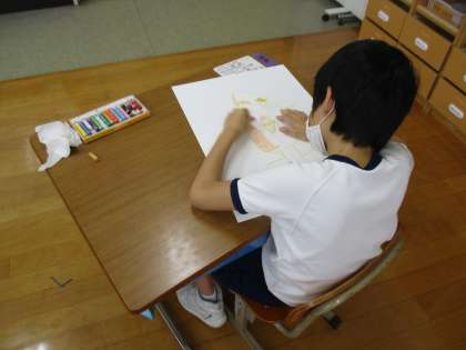 図画工作の学習で自分の顔を描きました。輪郭から描き始め,顔のパーツを1つ1つていねいに描いていきました。できあがった絵を見てみるとどの子も特徴をとらえた味のある絵に仕上がっていました。