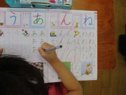 ひらがなの勉強の時間はとてもよく手があがります。今日も「あ」「う」のつく言葉の言葉集めをしました。いろいろな言葉が集まりました。