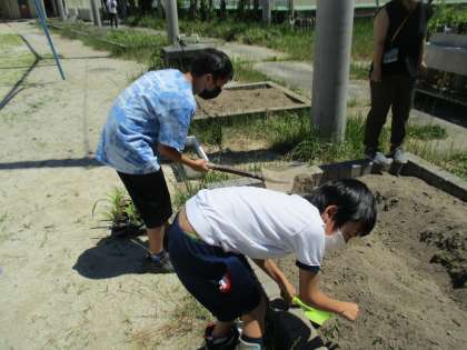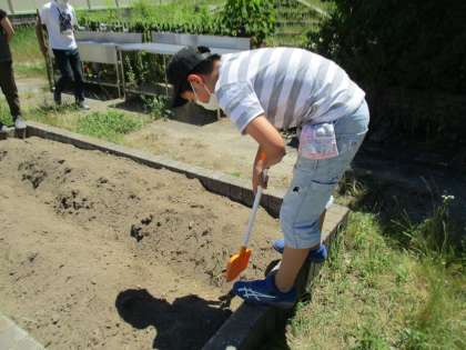 Bグループの子たちが生活単元の学習でポットで育てていたトウモロコシの苗を学校園に植え替えました。暑い中での活動でしたが,がんばってうねを作って植え替えました。 明日はAグループの子たちが残り半分のうねに植え替えを行います。