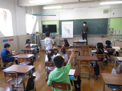 社会科では京都府やさらに詳しく京都市についての学習を進めています。写真は友だちの意見に対してハンドサインを用いて自分の考えを表しています!