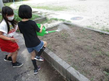分散登校の時にタネをまいたツルレイシがすくすく育っています。まだ芽が出ていないものもありますが,これからまだまだ大きくなります。今日も「私やります」と」水やりを買って出てくれたので,お2人にお願いしました!