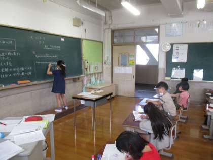 今日の算数は□を使った式という学習単元の最終回でした。今まで学習してきたことを踏まえて練習問題に取り組みました。最後のまとめでは,みんなでまとめを考えて学習を確認することができました。