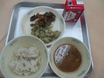 麦ごはん・牛乳・牛肉のしぐれ煮・ピーマンのごまいため・もずくのみそ汁