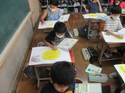 絵の具を3色だけ使って,夏みかんを描きました。形,色の濃淡,筆のおき方を工夫し,すてきな夏みかんが仕上がりました。