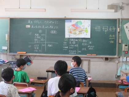 暑い日が続いています。家庭科の学習で,夏をすずしくさわやかに過ごすための工夫を考えました。服装や,家での工夫を考え,たくさんの意見が出てきました。これで今年の夏は快適に過ごすことができそうですね!学びをいかしていきましょう。