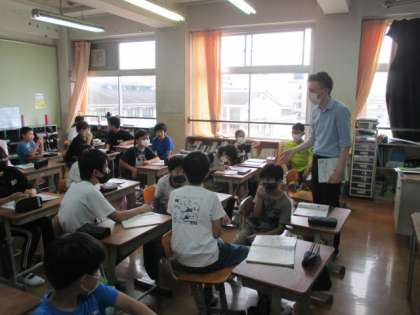 英語科の学習で,ALTのガレス先生に来ていただきました。発音の仕方や,単語の書き方などについても詳しく教えてもらい,コミュニケーションも楽しむことができました。会話することは一番の勉強になりますね。