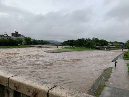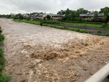 今朝は雨の音で何度も目が覚めました。朝にテレビをつけてみると,大雨の情報だけでなく,避難勧告,避難指示の情報も流れていました。そして学校へ行くときに鴨川,高野川の様子にびっくりしました。