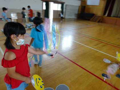 はりつけたテープが ひらひらと風になびいたり,高くうかび上がったり,それぞれに くふうをしながら楽しんでいました。
