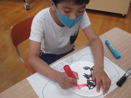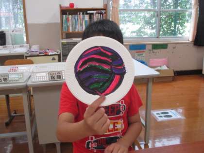 紙コップと紙皿を使って工作をしました。紙皿にきれいな模様を描いたり,好きな絵を描いたりして楽しみました。