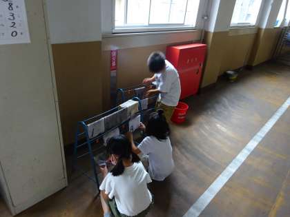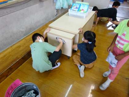 習字でよごれた教室を,みんなできれいにしました。自分の所も,人の所も,進んでふいてくれました!はじめる前よりもきれいになったかも・・・!!
