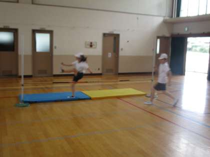 雨天の中でも体育の学習は進みます!今日から新しい単元の走り高跳びに取り組んでいます!今日はまず初めに準備の仕方や低い高さを飛んで踏み切り脚がどちらなのかを確かめていました!