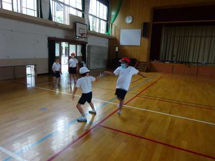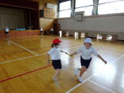 雨がふっていたので,体育館でバトンパスの錬習をしました。なるべく前を向いてバトンをもらったり,早めにスタートしたり,タイムをちぢめられるようにがんばりました。
